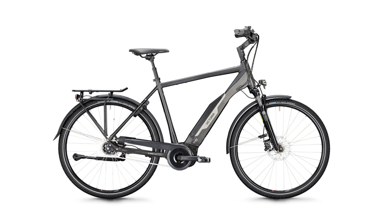 De verende SUNTOUR voorvork met 75 mm veerweg compenseert oneffenheden in de grond - of het nu gaat om kasseien in het stadscentrum of ruige bospaden. De 50 mm brede SCHWALBE "Marathon Plus" banden beloven een hoge lekbescherming en rollen gemakkelijk op asfalt.